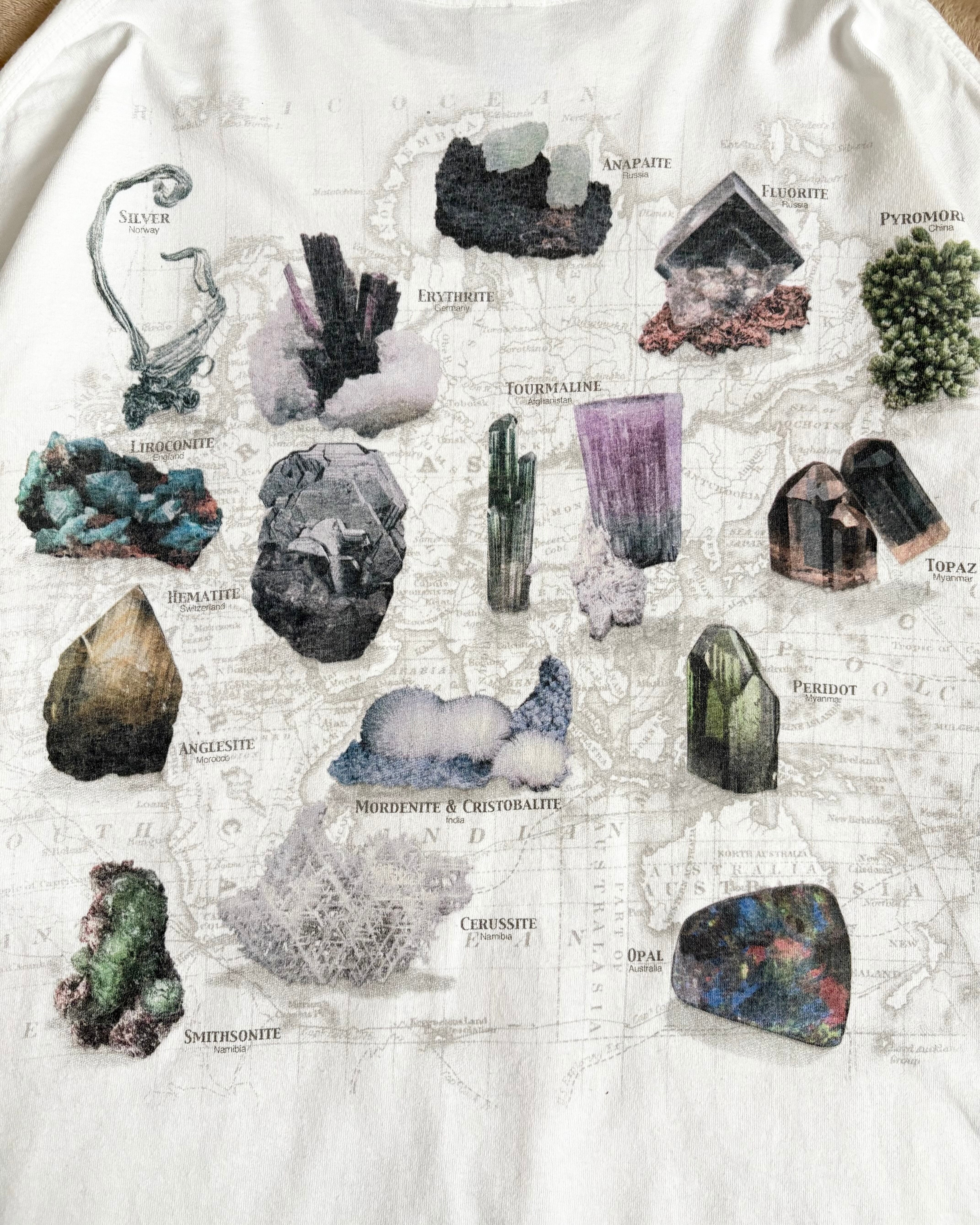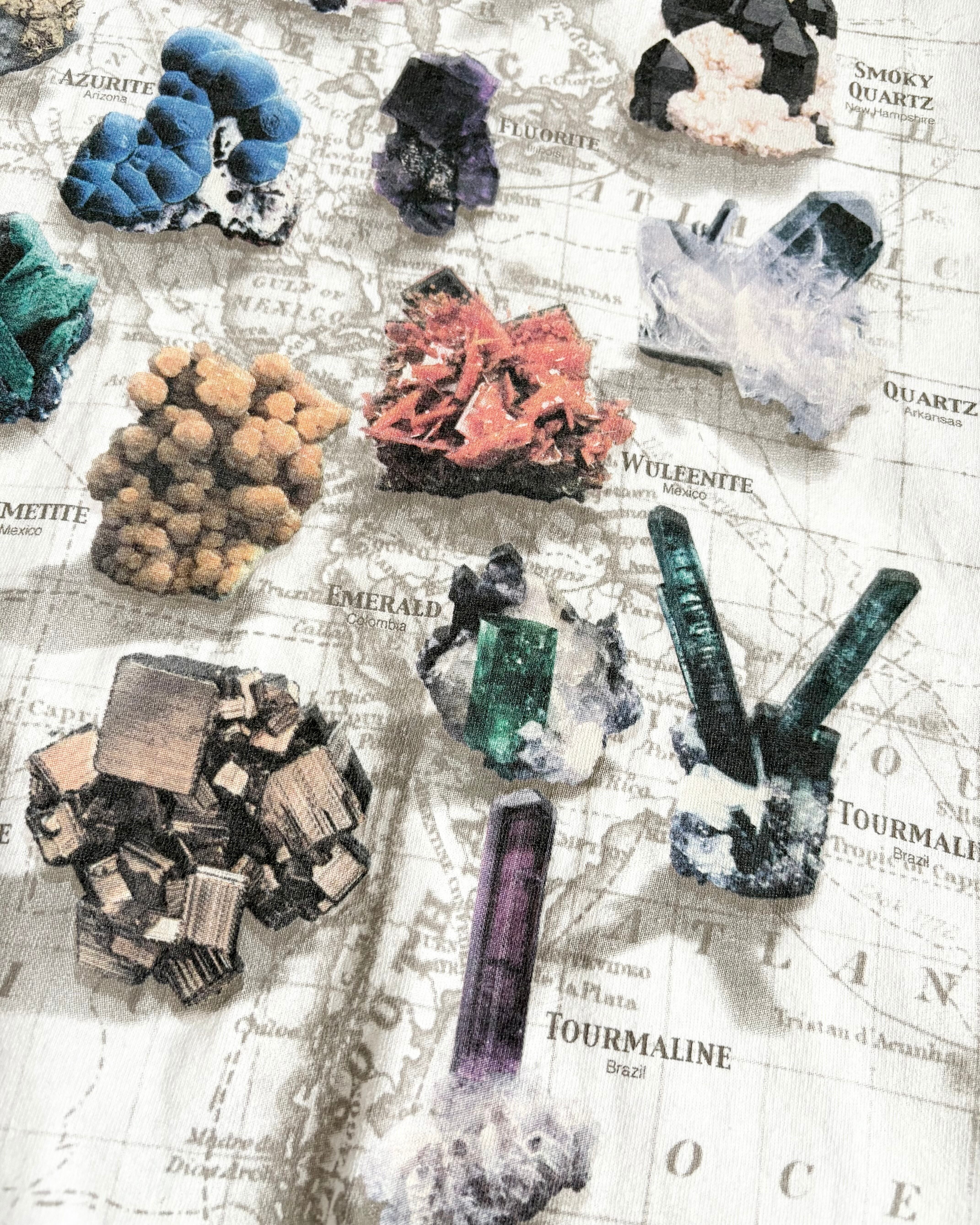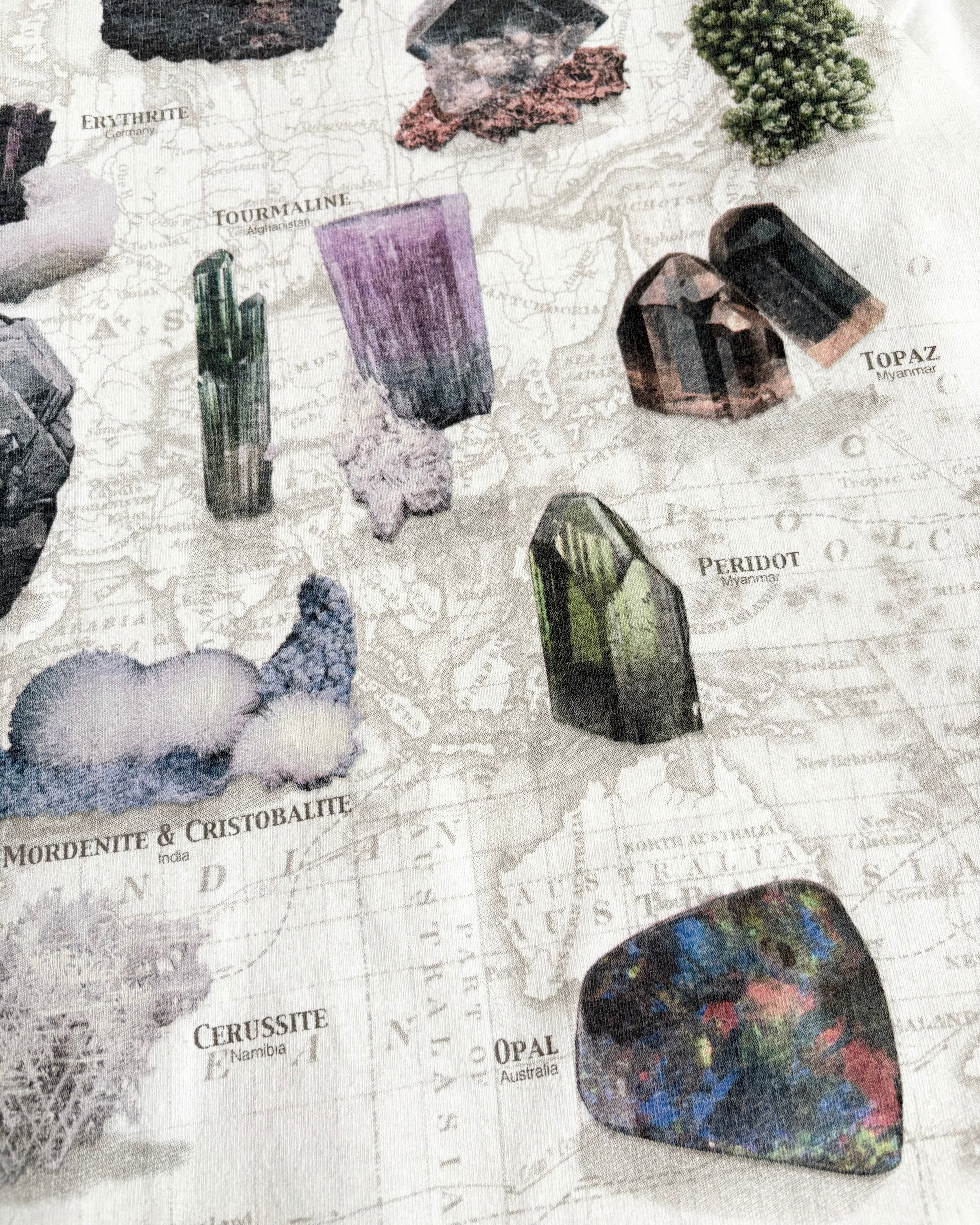 地図を背景に世界各地の鉱物や宝石の写真が