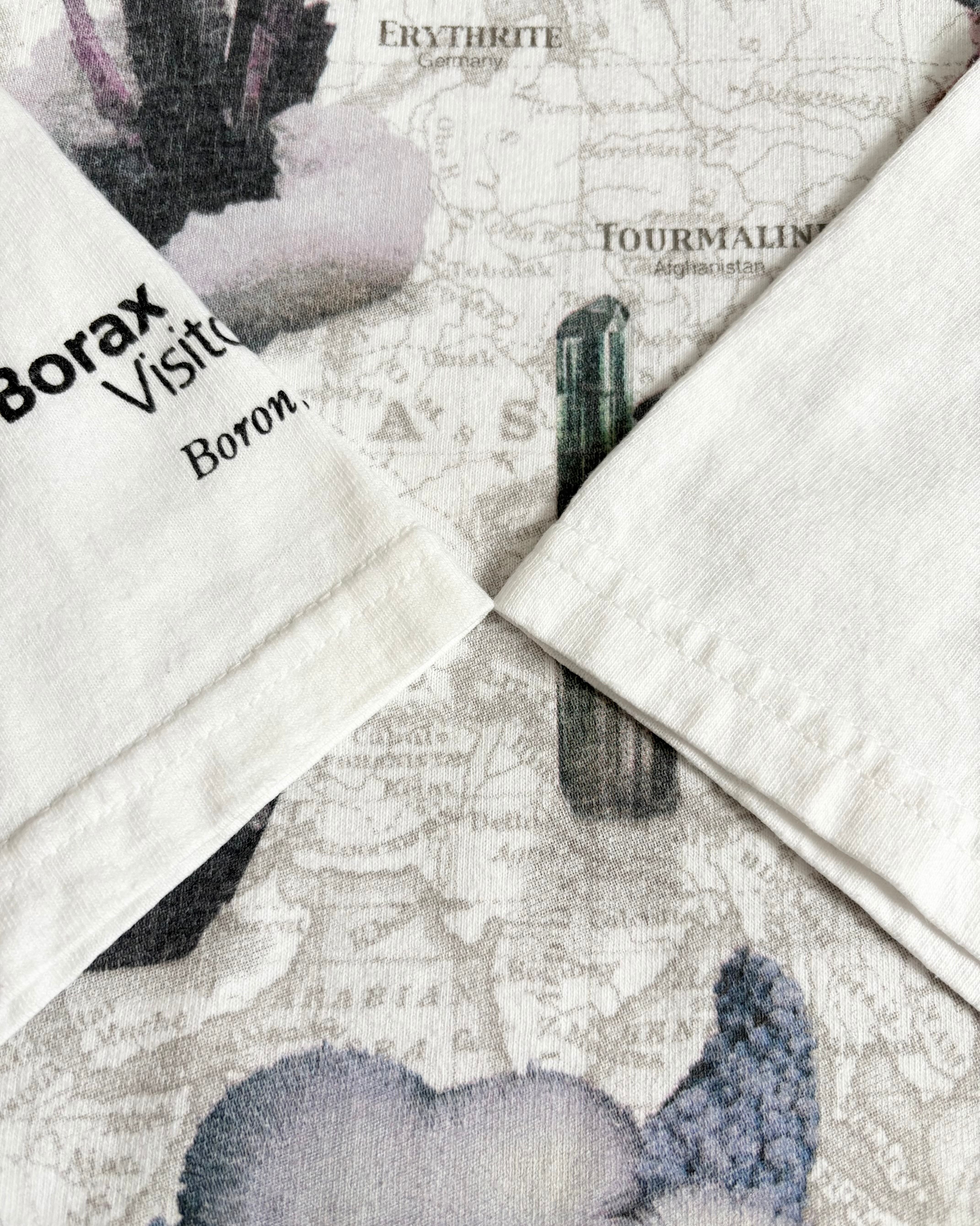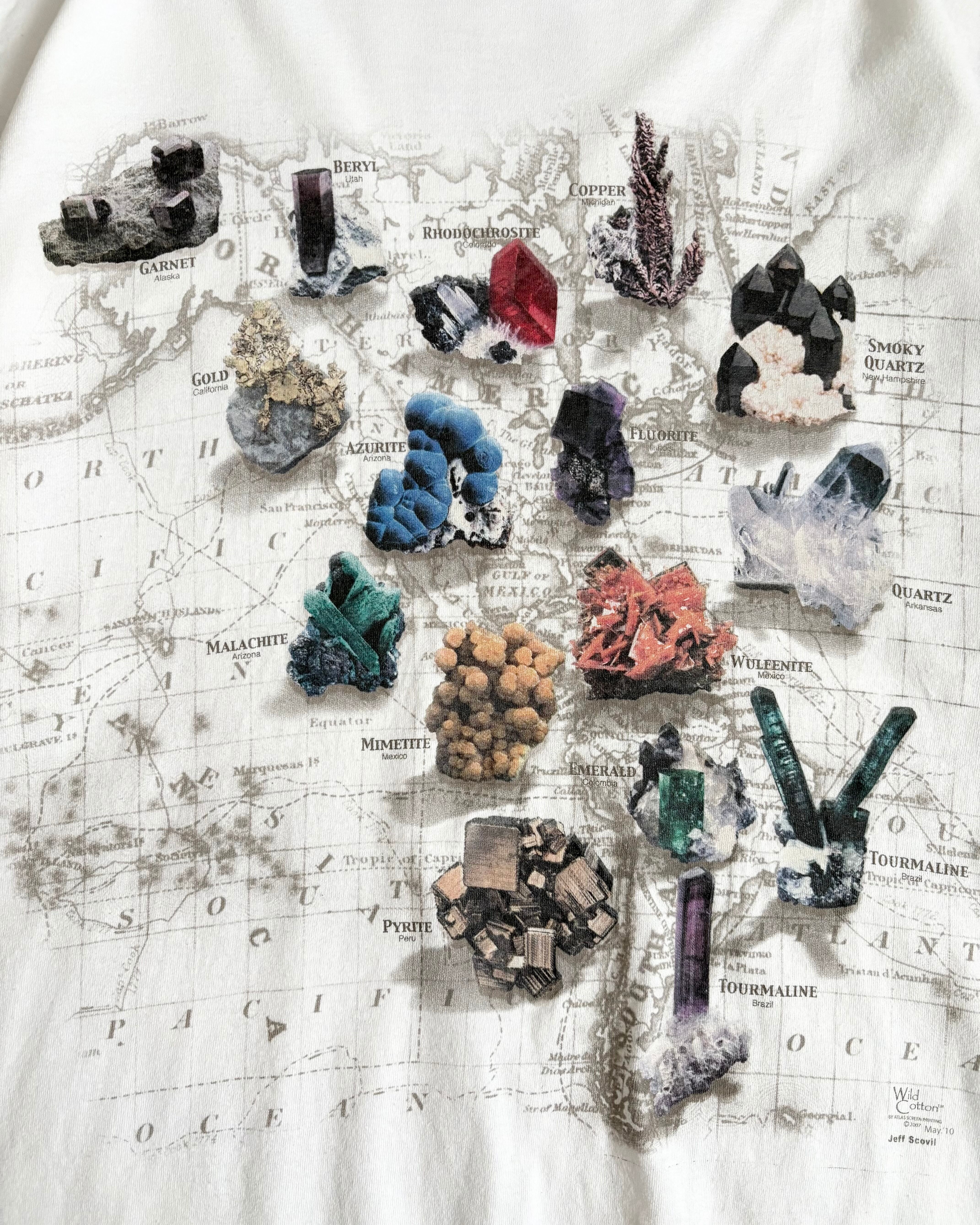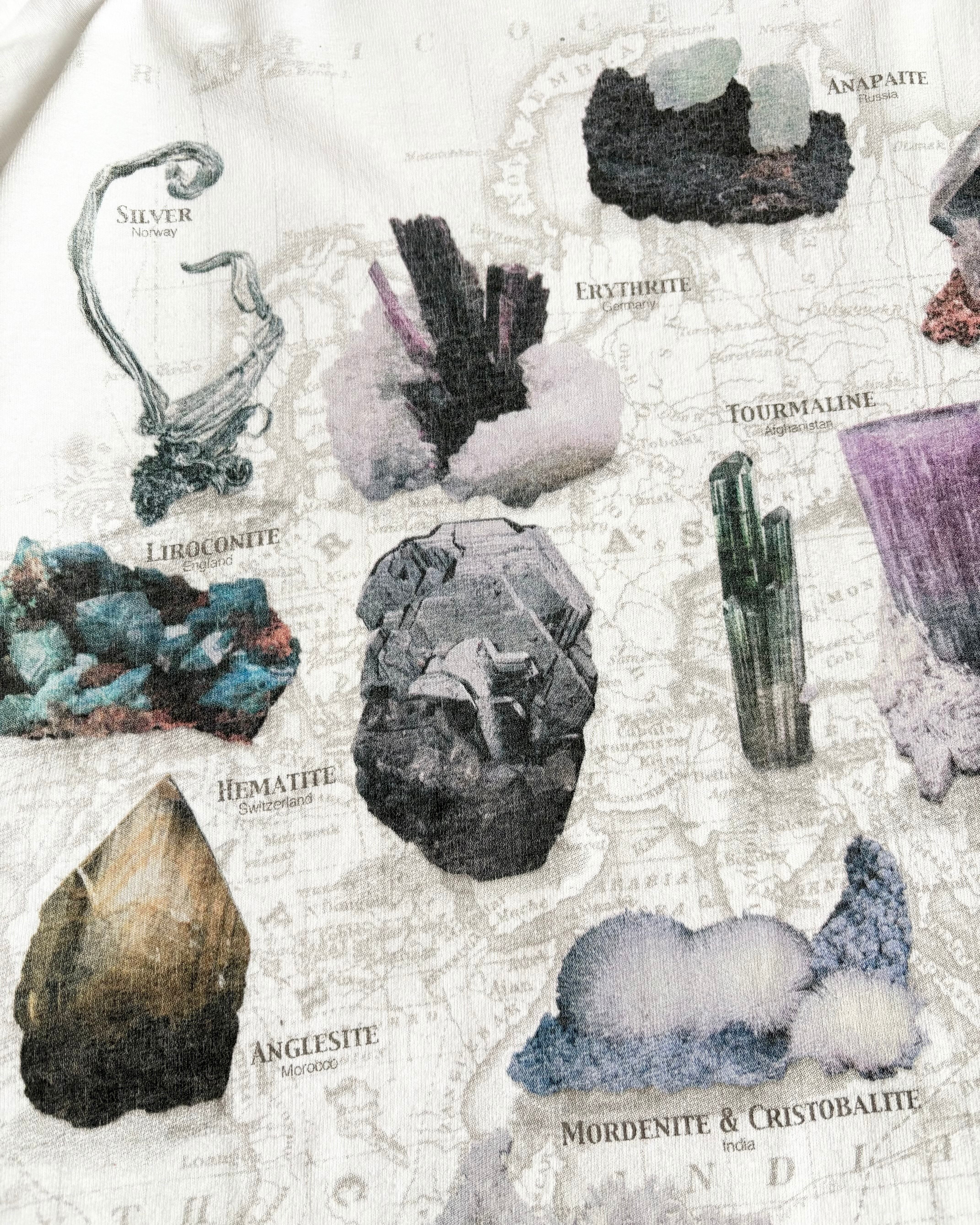 地図を背景に世界各地の鉱物や宝石の写真が