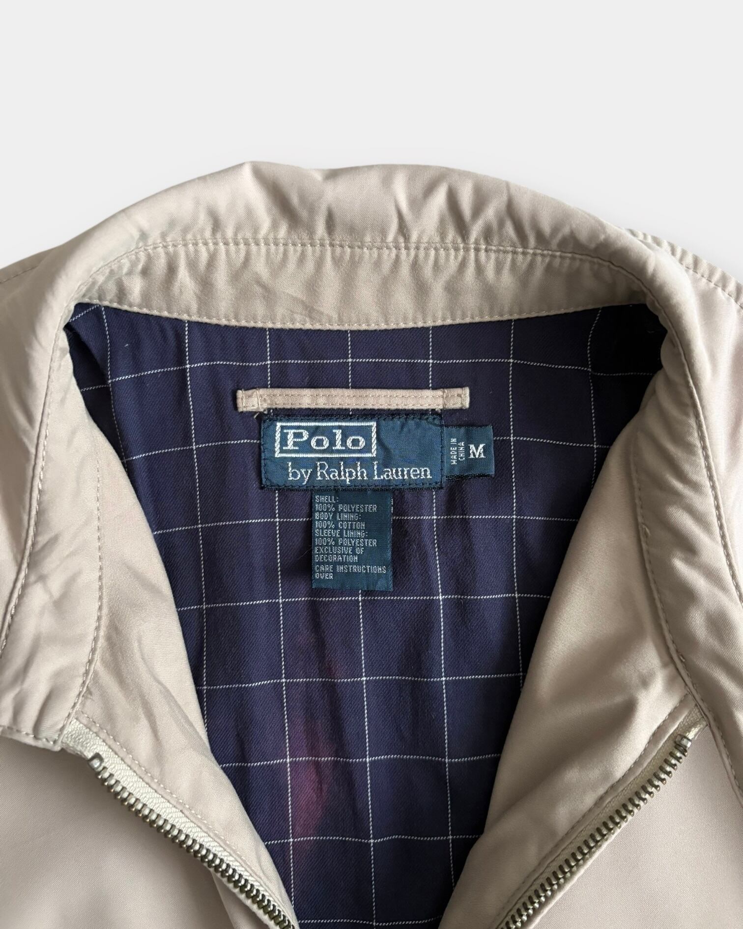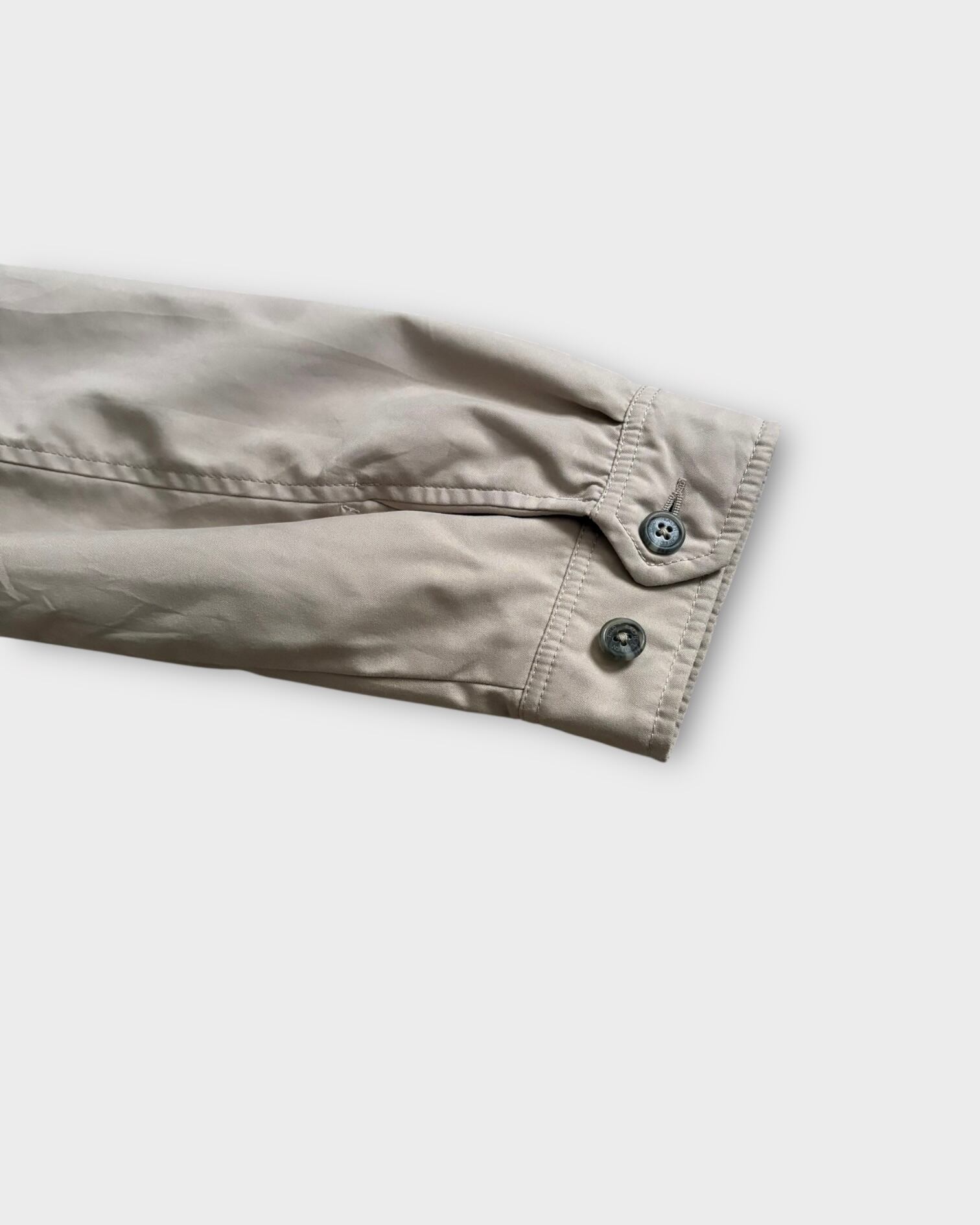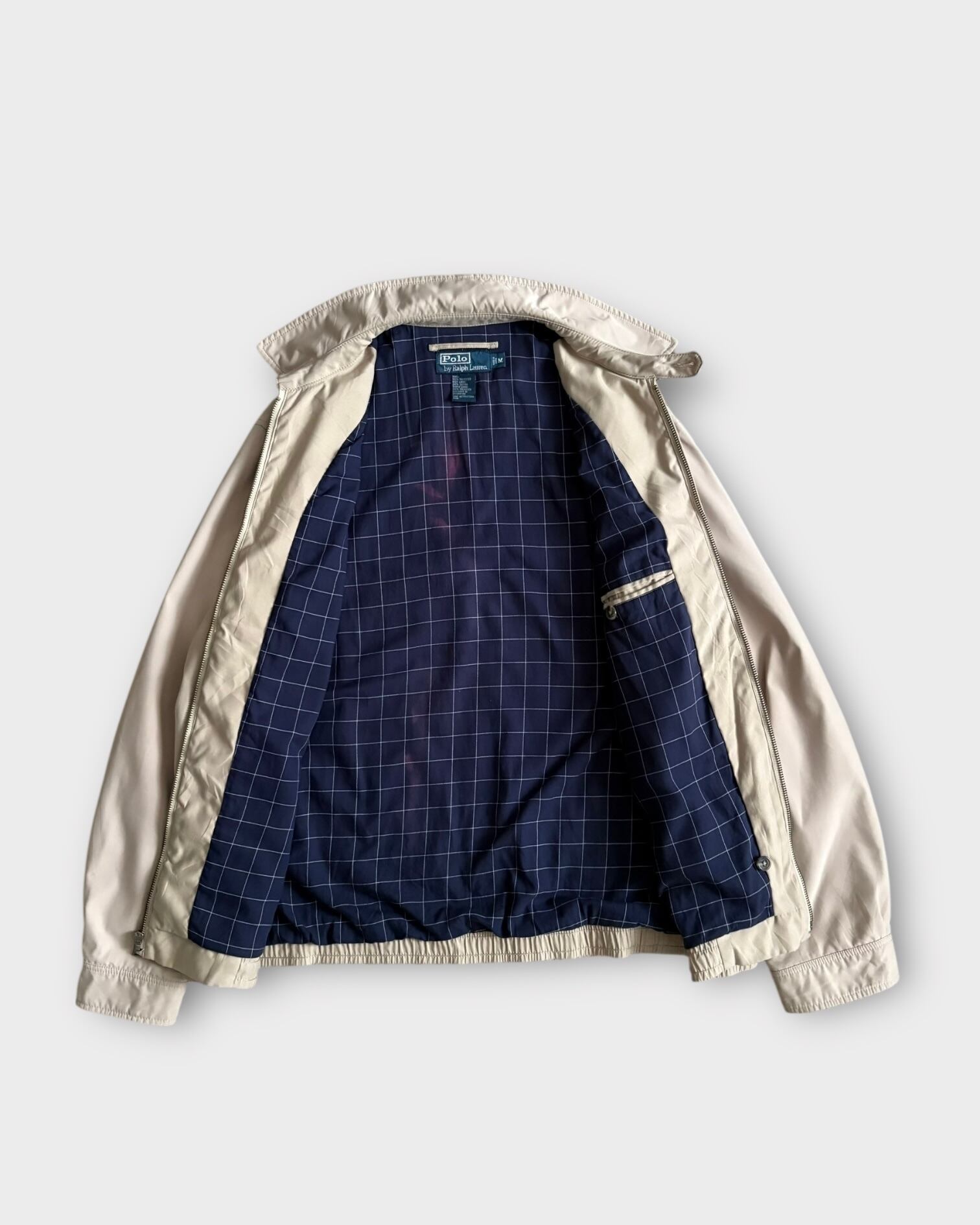 ライトベージュボディに裏地のネイビー×ホワイトのグラフチェック柄が映える非常に上品な一枚。