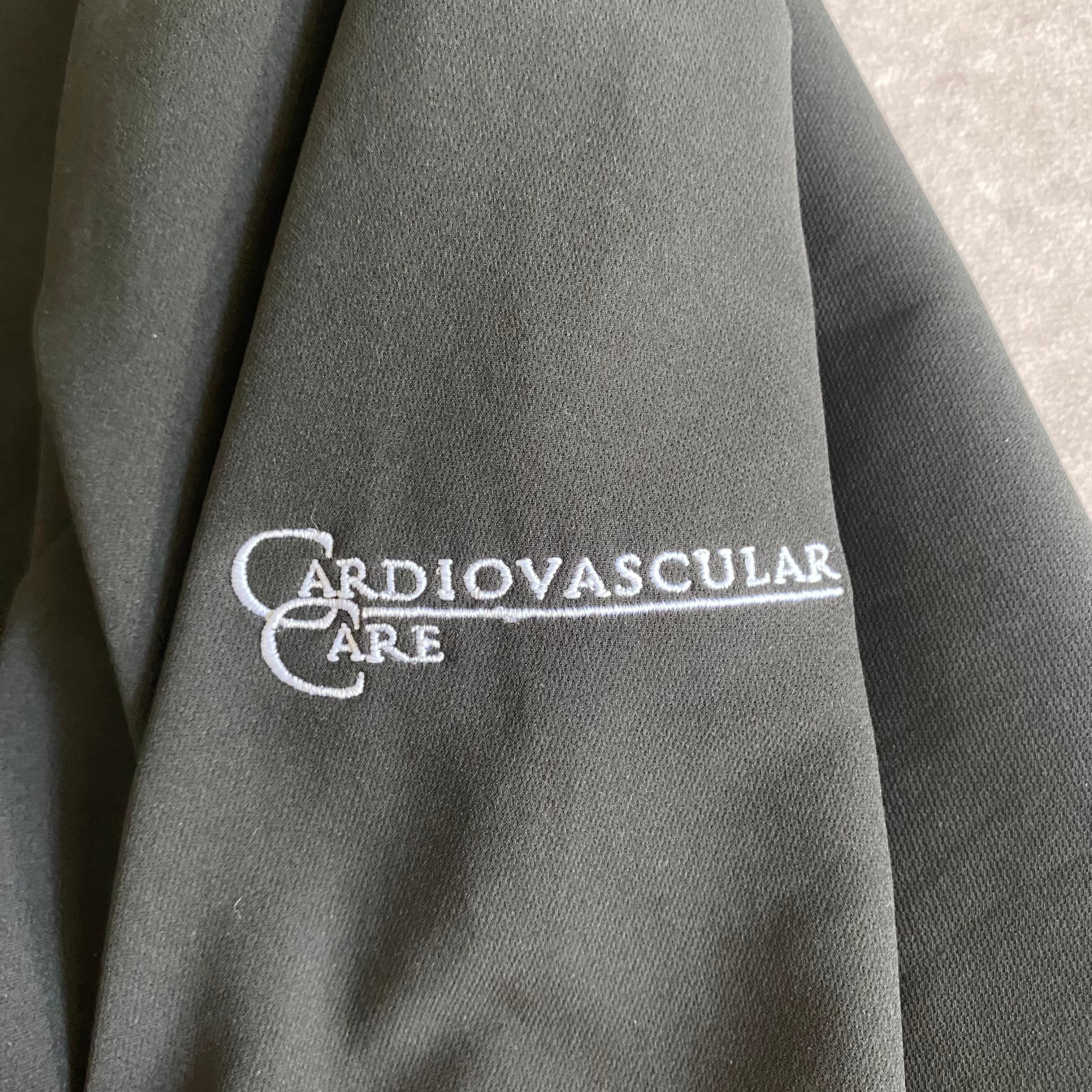 袖に医療関係の企業刺繍が入っています。